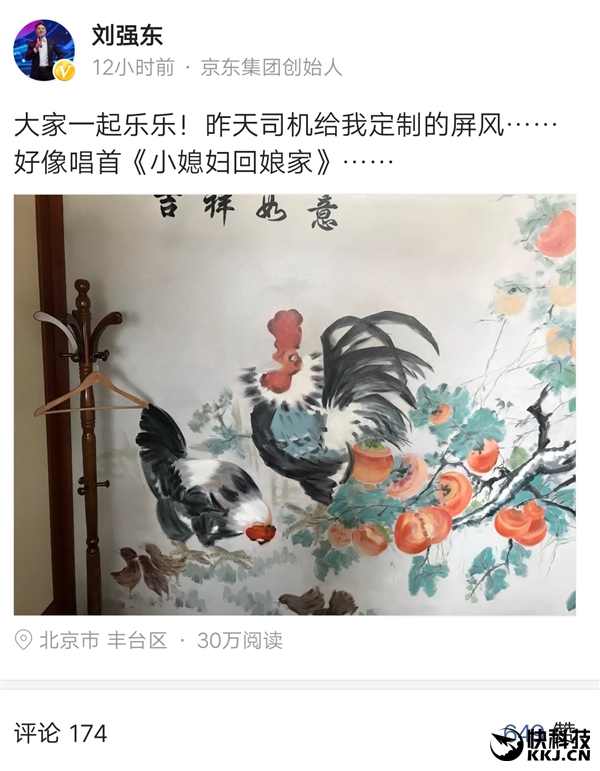 今天上午,東哥在微頭條分享最新動態,這是“昨天司機給我定制的屏風……好像唱首《小媳婦回娘家》……”