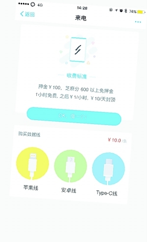 6月28日,北京商報記者來到朝陽大悅城,體驗來電科技出品的充電寶,該品牌充電寶位于大悅城地下一層地鐵出入口附近,首先映入眼簾的是“免押金”三個大字,但仔細觀察后可以發現,所謂的免押金需要芝麻信用達到600分以上,當北京商報記者掃描充電寶機身上的二維碼時,手機會提示確認開通支付寶免密支付的協議,開通后可以進入租借界面,值得注意的是,來電科技的充電寶不提供數據線服務,但租借界面提供購買數據線的服務,包括蘋果數據線、安卓數據線以及Type-C數據線。如果用戶芝麻信用沒有達到600分以上則需要繳納100元的押金。來電充電寶的收費情況為1小時內免費,超過1小時后1元/時,10元/天封頂。經過實際體驗后北京商報記者發現,來電科技的充電寶輸出可達到2.5A,一部iPhone 6s 10分鐘充電約5%。但退還時提示不明顯,導致記者一次退還失敗。