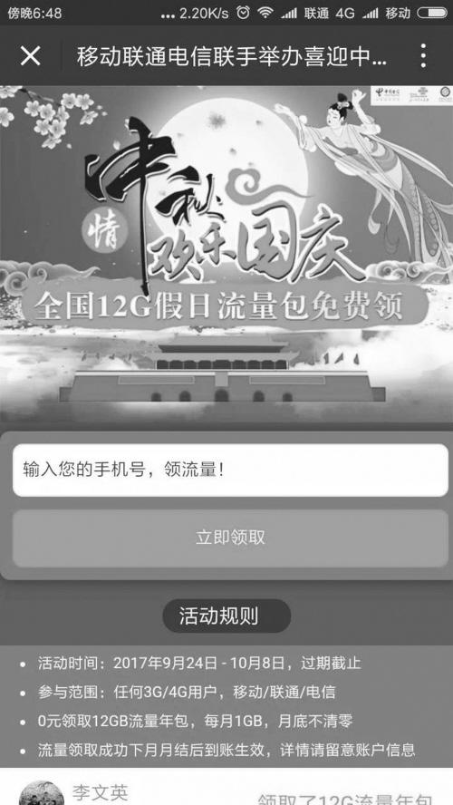 “移動、聯通、電信聯手舉辦喜迎中秋活動,2G流量免費領!”臨近“十一”、中秋長假,這個看似“喜大普奔”的活動刷爆沈陽市民的微信朋友圈,三大運營商聯手發節日“福利”,這活動是真的嗎?9月29日,沈陽網警辟謠,發“福利”的活動當然不是真的,別再上當啦!