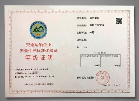 2017年12月12日,中國道路運輸協會城市客運分會受交通運輸部委托,根據《交通運輸企業安全生產標準化建設評價管理辦法》及相關標準規范的要求,將我國的第一張“交通運輸企業安全生產標準化建設等級證明”頒發給首汽約車,達標等級為“一級”。首汽約車是我國首個獲得該證書的網約車企業,同時也是截至目前唯一一個獲得該證書的交通運輸企業。