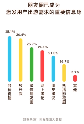 事實(shí)上,微信平臺(tái)不僅在用戶出游前的資訊獲取和出游過(guò)程的動(dòng)態(tài)分享中扮演重要角色,而且對(duì)用戶的旅游購(gòu)買決策也擁有較大的影響力。《報(bào)告》中來(lái)自同程旅游大數(shù)據(jù)的研究顯示,“特價(jià)促銷”、“放長(zhǎng)假”和好友的朋友圈分享是影響人們旅游購(gòu)買決策的三大因素。有相當(dāng)一部分微信用戶在看到好友朋友圈分享的出游動(dòng)態(tài)后萌生出游的想法,或者通過(guò)好友群等渠道獲取出游建議等信息。