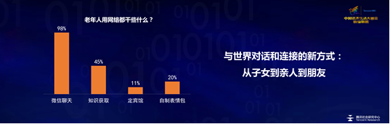 作為國內(nèi)領先的互聯(lián)網(wǎng)增值服務商,騰訊依托豐富的社交大數(shù)據(jù)積累,與央視聯(lián)合發(fā)布《互聯(lián)網(wǎng)與中老年人的社交和社會參與》大數(shù)據(jù)報告。報告指出,互聯(lián)網(wǎng)社交正在向縱深發(fā)展,老年人逐漸成為微信增長主力,2017年微信數(shù)據(jù)報告顯示,55歲以上老年用戶達到5500萬,互聯(lián)網(wǎng)已經(jīng)成為老年人與世界對話和連接的新方式。