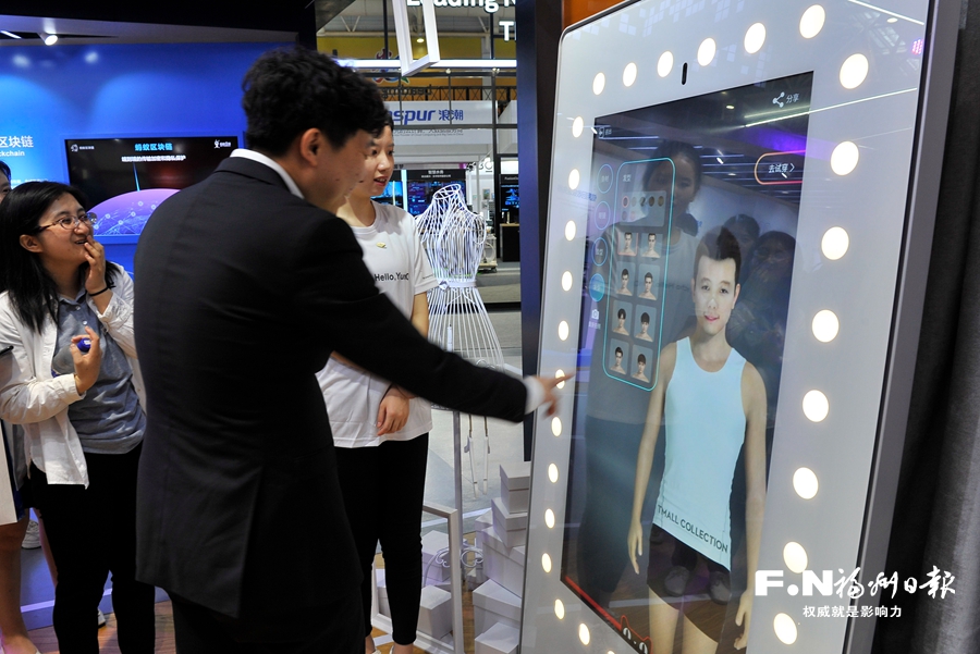 阿里巴巴展區,參觀者體驗智能試衣鏡。福州日報記者蔣雅琛林洛羽/文池遠/攝
