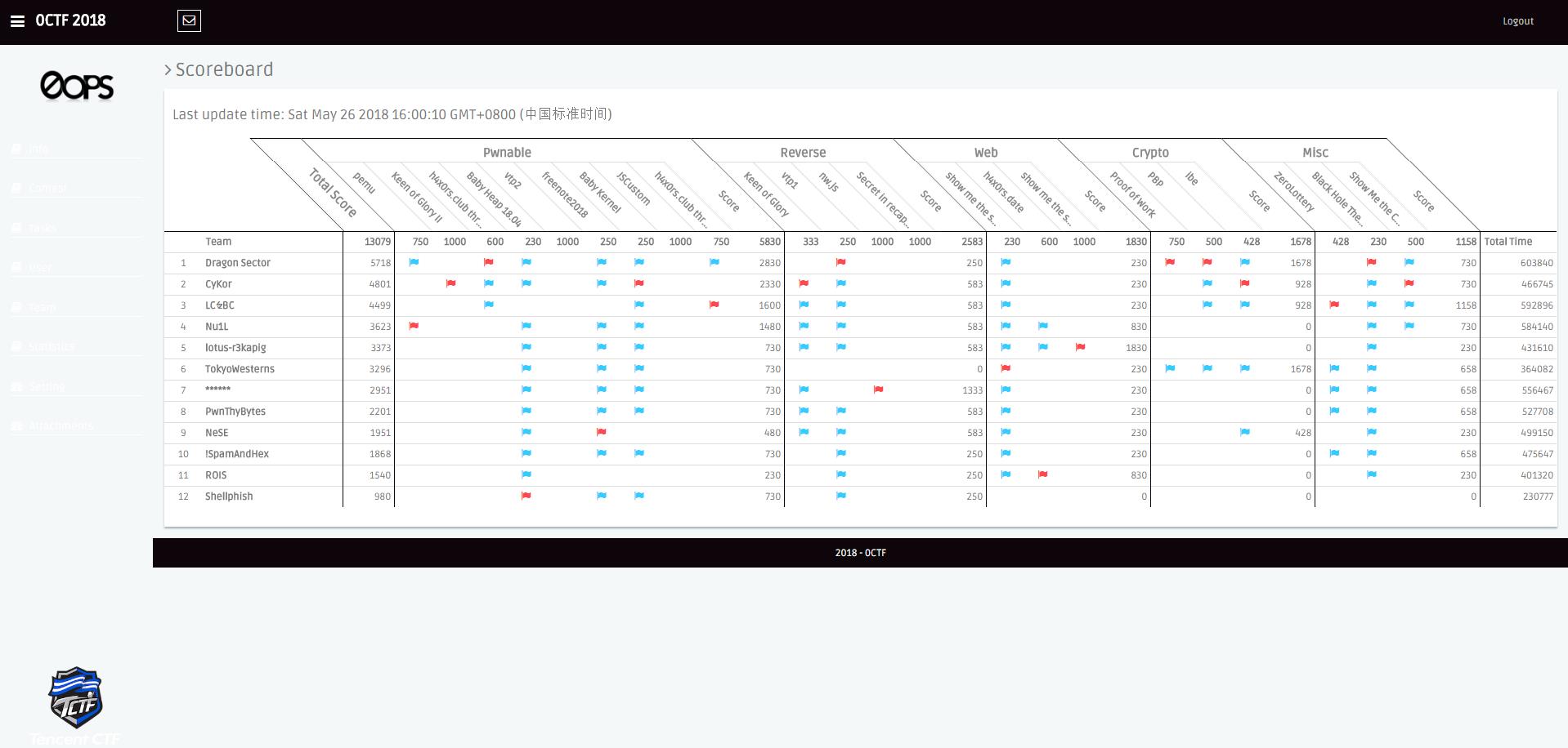 5月26日決勝之日,各大戰隊之間的較量進入白熱化。面對韓國CyKor戰隊在首日的“霸榜”表現,波蘭Dragon Sector戰隊奮起直追,不斷縮小與CyKor戰隊的分差,并在11:35成功反超,首次出現在得分榜首位。隨后兩支戰隊的競爭進入高潮,交替爭奪榜首位,在比賽的最后兩小時形成拉鋸戰。最終,波蘭Dragon Sector戰隊憑借917分的大比分領先,以總分5718分斬獲TCTF 2018國際賽冠軍,韓國CyKor戰隊和俄羅斯LCBC戰隊以總分4801、4499分獲亞軍、季軍。