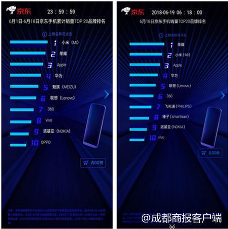 2、關于榮耀和小米在6月1日-18日累計銷量排名出現的變化,是因為6月18日0:00開始,根據競速榜規則,系統對下單后6小時未結算的訂單進行了刪除,導致6月19日,榮耀和小米 的在6月1日-18日累計銷量排名發生變化。