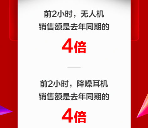 各種新奇特的商品也受到消費者熱捧。1日到10日游戲手機銷量是10月同期的2倍,海底撈自熱火鍋銷售額增長了500%,智力快車早教兒童機器人增長200%。