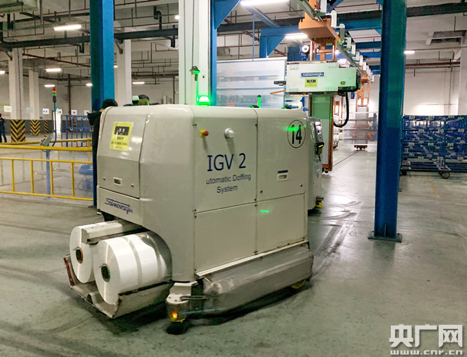 智能機器人搬運著長絲餅駛過。(央廣網(wǎng)記者馬文靜 攝)