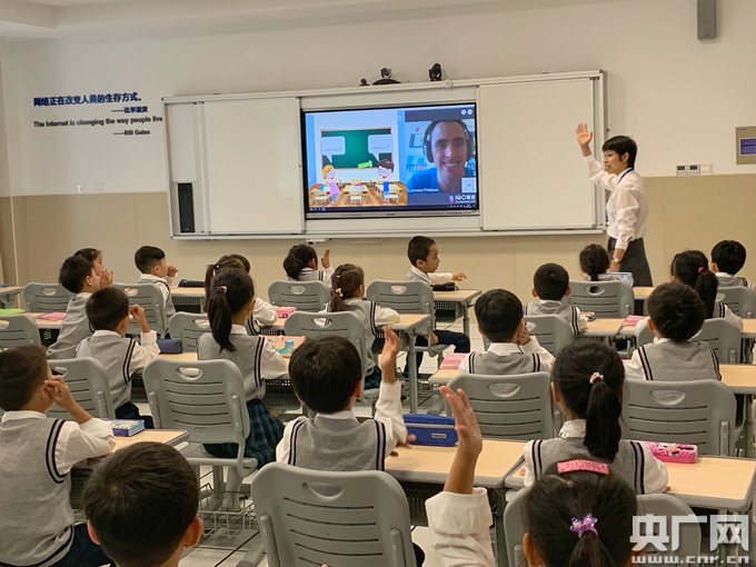 桐鄉(xiāng)尚陽實驗學校課堂上,學生與外教熱情互動。(央廣網(wǎng)記者馬文靜 攝)