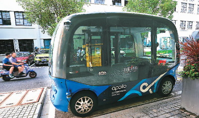 8月19日,由百度參與研發的全球首款L4級別無人駕駛巴士“阿波龍”通勤車亮相長陽創谷。