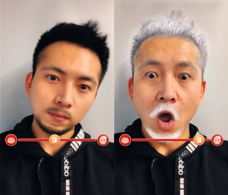 在體驗(yàn)“我的一生”魔法表情時(shí),記者發(fā)現(xiàn)用戶可以通過手動(dòng)操控?fù)u桿的方式,體驗(yàn)實(shí)時(shí)的年齡漸變。實(shí)時(shí)的算法運(yùn)行穩(wěn)定,臉部實(shí)時(shí)動(dòng)作、臉部和頭發(fā)邊界的渲染也十分真實(shí)自然。此外,全新上線的“時(shí)間相框”魔法表情,也可以由用戶以眨眼的方式,自主切換不同年齡段。而在“恍如隔世”和“潮老人”的魔法表情中,用戶只需對(duì)準(zhǔn)屏幕拍攝,即可體驗(yàn)到2秒后變老,以及變老后的潮酷形象。