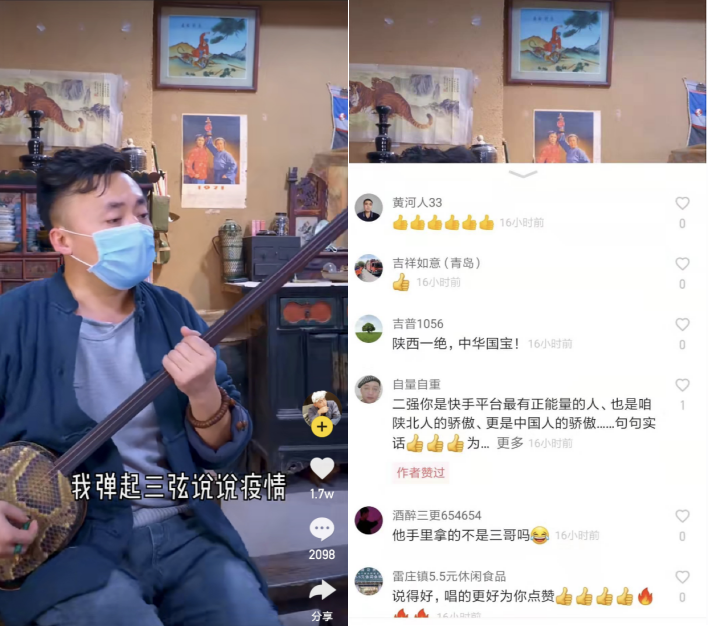 用戶貳強(ID:deq16888)在快手上擁有69.9萬粉絲,是一名陜北傳統文藝愛好者。貳強尤其擅長陜北說書,疫情期間,他將勸告大家不要走親訪友的“勸阻”詞寫進陜北說書里,然后手撥三弦,以網友們們愛聽的陜北曲調高亢地唱出來。