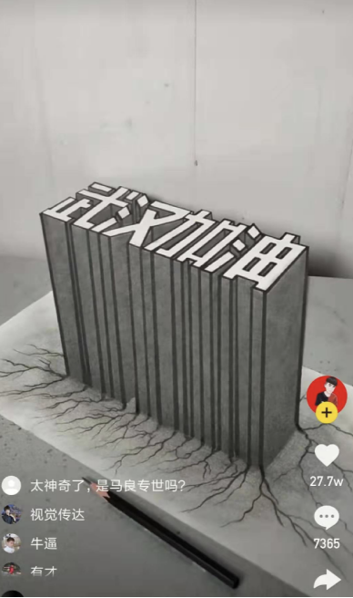 自學繪畫者“阿升”( ID:shi000666)用一張紙,一支筆,一把尺子,便將“武漢加油”四個字描摹得立體感十足,如同手工3D打印一般。像一個建筑一樣高聳矗立著。該條視頻獲得老鐵27.7萬點贊。