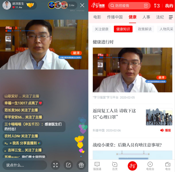 2月6日,“學習強國”學習平臺與快手攜手,邀請相關領域專家、名醫(yī),為全國用戶就疫情防護進行不同主題的科普和答疑。首場直播由上海市肺科醫(yī)院副主任醫(yī)師胡洋主講,系統(tǒng)地介紹了疫情防護知識并為老鐵們辟謠。快手用戶為胡醫(yī)生送出181.35萬個贊。