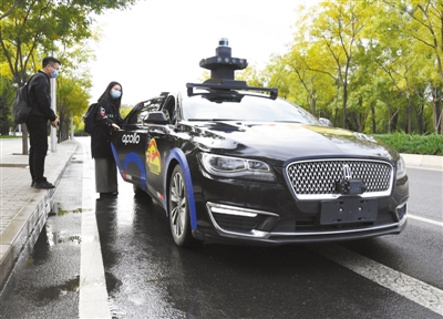 市民在北京市海淀區(qū)稻香湖路的百度自動(dòng)駕駛出租車(chē)指定上車(chē)點(diǎn)乘車(chē)。新華社記者 任超攝