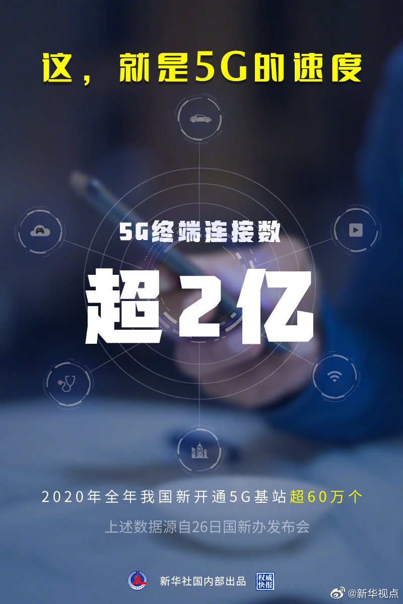 工信部26日發布數據,2020年全年我國新開通5G基站超60萬個,5G終端連接數超過2億,超高清視頻、云游戲等個人應用場景逐漸豐富。5G網絡和終端商用快速發展,越來越多的人感受到5G的速度。(記者:張辛欣 海報設計:張晨光) ????