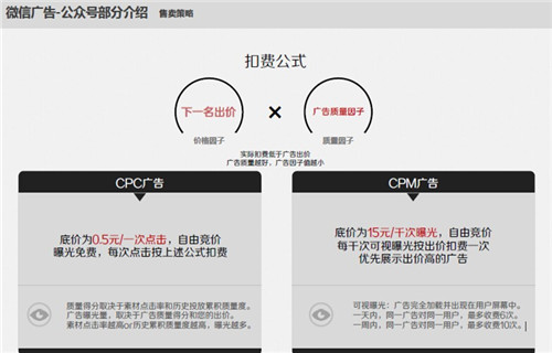 資料顯示,微信CPC廣告底價為0.5元/一次點擊,自由競價,曝光免費;CPM廣告底價為15元/千次曝光,自由競價,每千次可視曝光按出價扣費一次,優先展示出價高的廣告。