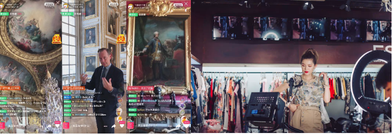 左為凡爾賽宮直播,右為杭州四季青某服裝店老板娘正在淘寶直播間展示服裝。