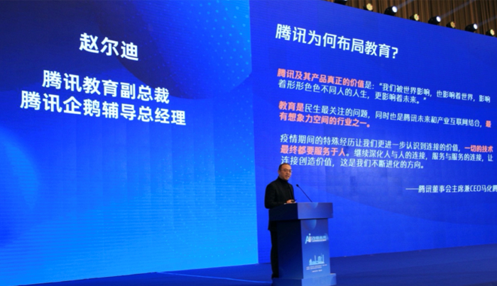 在峰會主論壇,趙爾迪發表《科技向善:技術推動智慧教育升級》主題演講,系統介紹了騰訊教育成立的背景、目標、業務、智慧教育解決方案、平臺能力和教育成果。據他介紹,科技向善是騰訊的企業使命愿景,通過技術推動在線教育智慧化是騰訊努力的方向。
