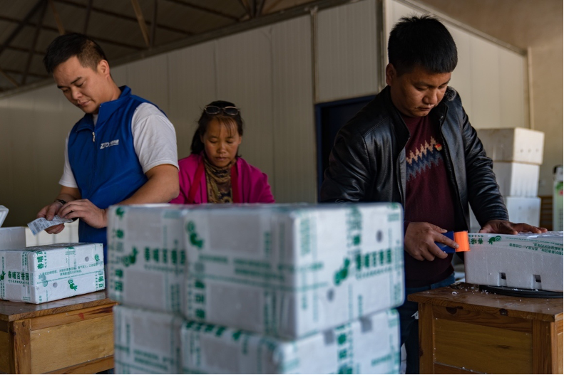 ▲李能龍(右)正在和工人們一起打包快遞。 (穆功 攝)
