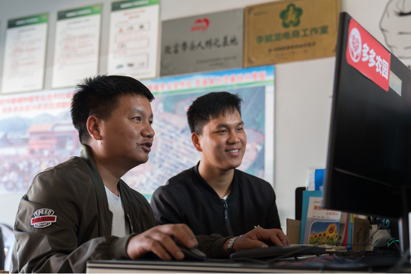 ▲李能龍(左)正在跟合作社社員肖小雙(右)探討拼多多店鋪的運營。 (穆功 攝)