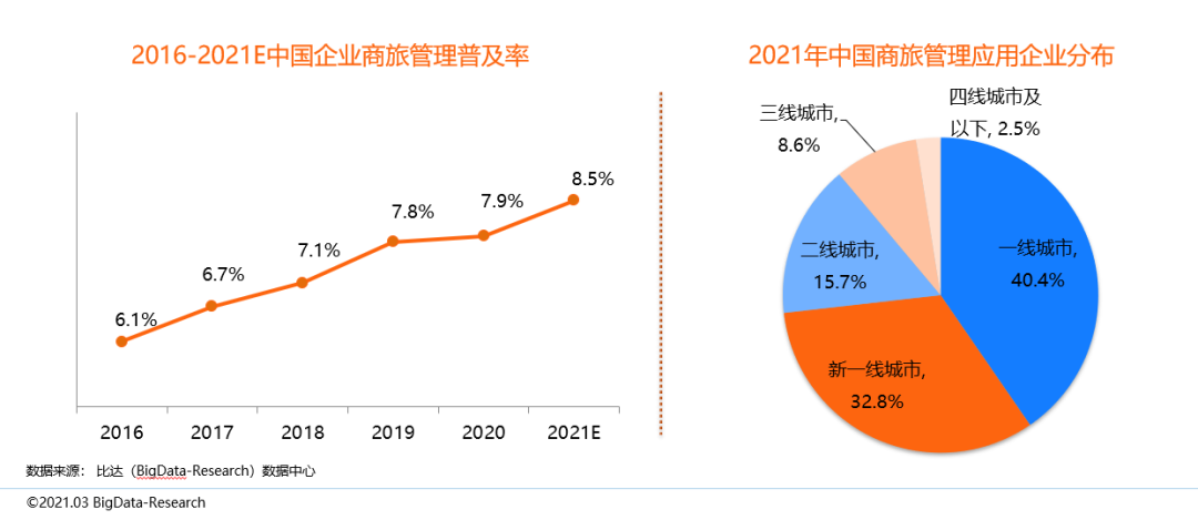 中國企業商旅管理普及率逐步攀升,受疫情影響,2020年普及率相比2019年略有增長,2021年隨著商旅市場的回暖,中國企業商旅管理普及率將提升至8.5%。另一方面,從如下數據可看到中國企業商旅管理應用企業中73.2%分布在新一線和一線城市。