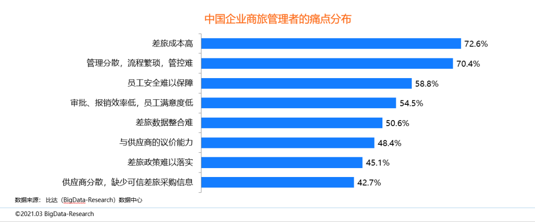 通常,人力成本和差旅成本是企業支出的兩大成本,差旅成本占企業支出的10-20%。在企業差旅方面,調查結果顯示,對于管理者來說,“差旅成本高”是最大的痛點,而“管理分散,流程繁瑣,管控難”也是企業管理者面臨的主要問題。