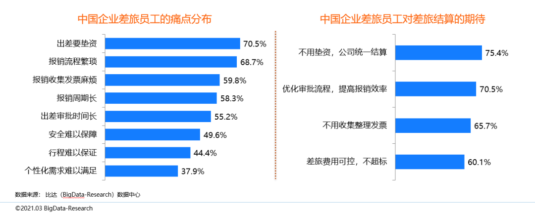 調查數據顯示,“出差要墊資”(70.5%)和“報銷流程繁瑣”(68.7%)是中國企業商旅員工的最主要的痛點,多數差旅員工還認為報銷收集發票麻煩、報銷周期長、出差審批時間長。而對差旅結算的期待方面,七成以上的差旅員工期待“不用墊資,公司統一結算”、“優化審批流程,提高報銷效率”。