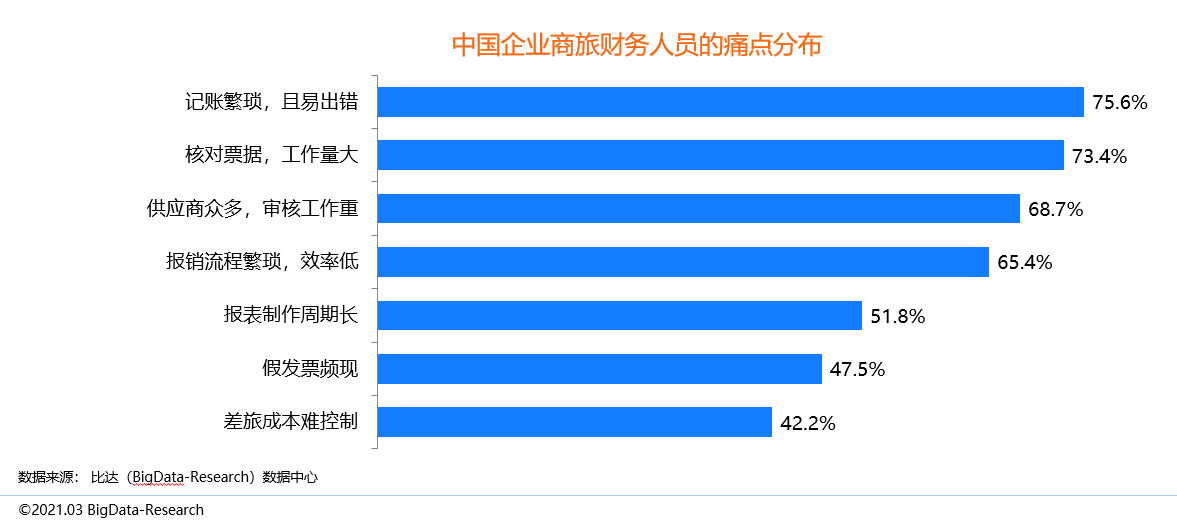 中國企業商旅財務工作面臨諸多問題,財務管理水平一定程度上關系到企業的進一步壯大發展。調查結果顯示,“記賬繁瑣、且易出錯”和“核對票據工作量大”是企業財務人員的主要痛點。