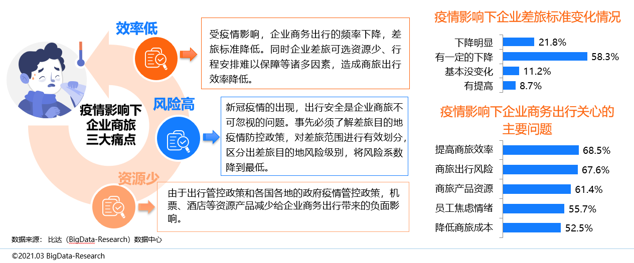 效率低、風險高和資源少是疫情影響下企業商旅的三大痛點。隨著國內疫情得到了有效控制,企業生產逐步復蘇,業務量逐步恢復,但受疫情影響,企業商務出行更加關注商旅效率、出行風險和商旅產品的資源配備等問題。