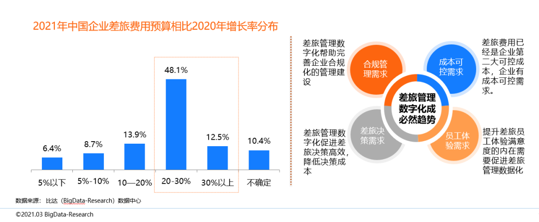 差旅費用已經是企業第二大可控成本。2021年,中國企業商旅需求將會有較快速的恢復,調查結果顯示,有60.6%企業認為差旅費預算2021年比2020年增長20%以上。差旅費用數字化轉型已成企業剛需,同時也是企業成本可控、合規管理、差旅決策和員工體驗需求平衡的需要。差旅為企業剛需是企業進行商旅管理的內在因素。