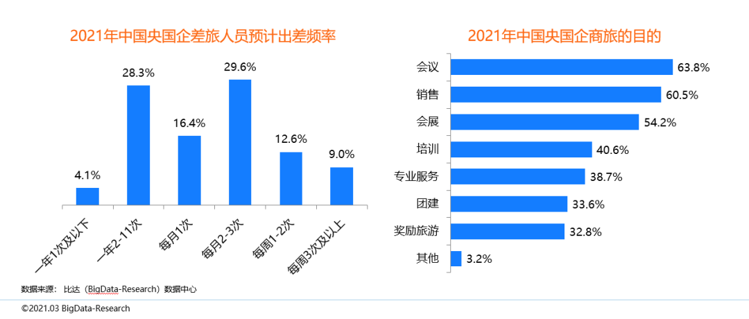 央國企差旅人員每月2-3次居多,會議為最主要目的