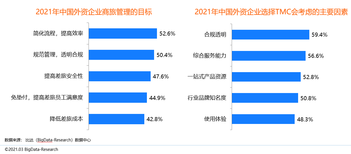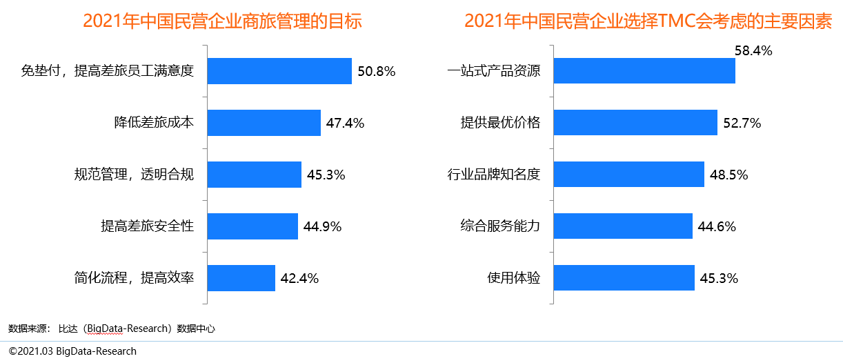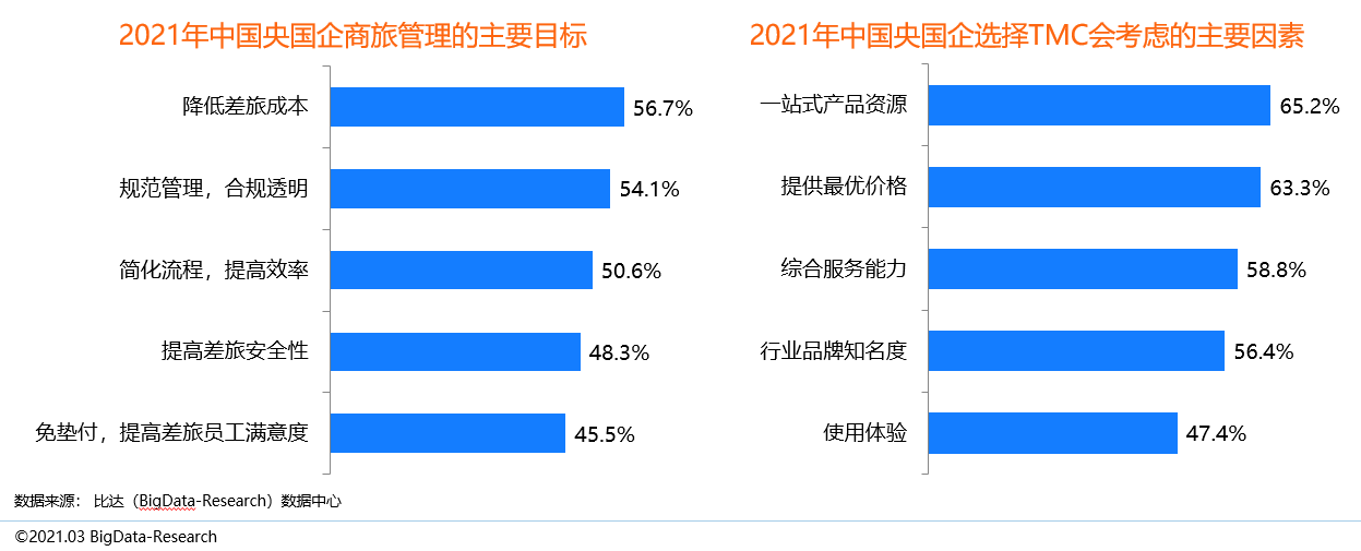 TMC商旅服務的好處在于讓企業商旅節約成本,合規透明,提高效率,安全有保障,并進一步提高員工滿意度。受疫情影響,2021年,央國企商旅管理將降低差旅成本和提高差旅安全性作為主要目標。同時,在選取TMC時會首選考慮一站式產品資源,其次為提供最優價格以及綜合服務能力。