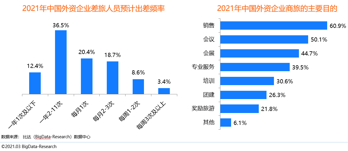 受疫情影響,特別是國外疫情仍然嚴重,我國外資企業差旅頻次下降明顯。調查結果顯示,2021年,外資企業差旅人員預計每年出差2-11次的占比最高,達36.5%,其次為每月1次,占比20.4%。而外資企業差旅人員商旅的主要目的是銷售,其次為會議、會展和專業服務等。