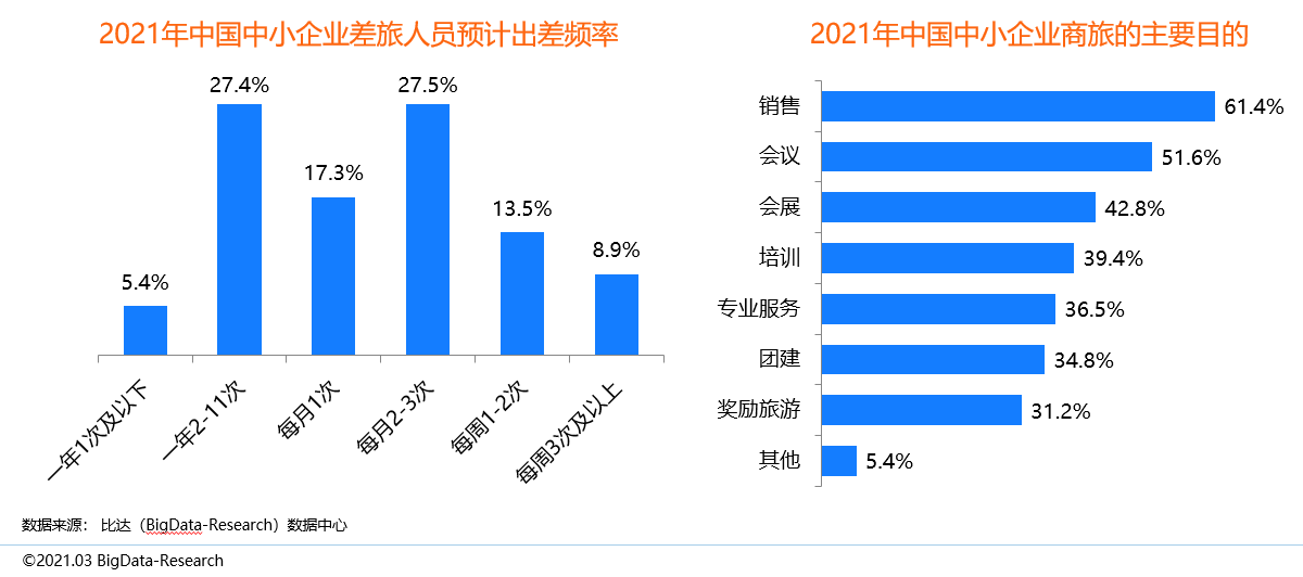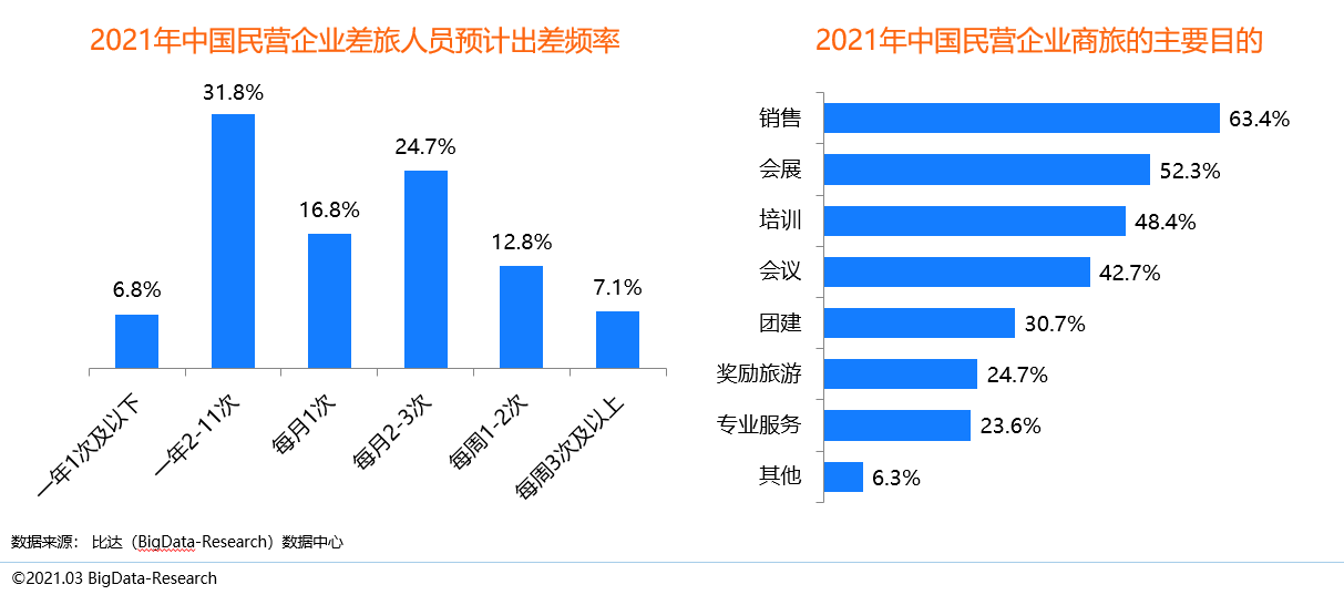 2021年出差旅人員預計一年2-11次的占比最高,達31.8%。而民營企業商旅的主要目的第一是銷售,其次為會展、培訓和會議。