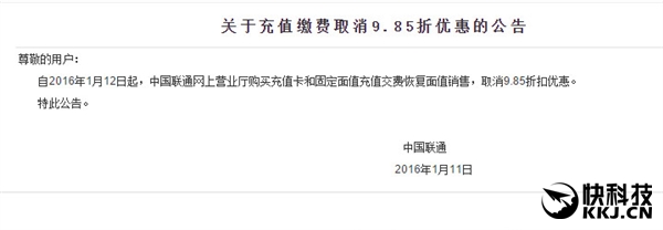 日前,中國聯通突然在官方發布公告,宣布自2016年1月12日起,中國聯通網上營業廳購買充值卡和固定面值充值交費恢復面值銷售,取消9.85折扣優惠。