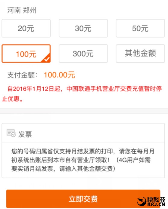 自2016年1月12日起,中國聯通網上營業廳購買充值卡和固定面值充值交費恢復面值銷售,取消9.85折扣優惠。