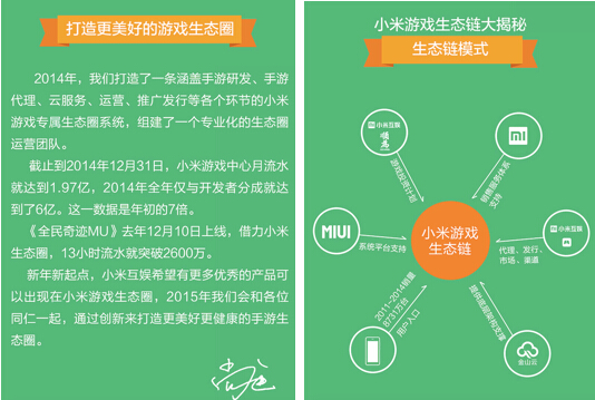 小米互娛總經(jīng)理尚進(jìn)表示:“2014年,我們打造了一條涵蓋手游研發(fā),手游代理,云服務(wù),運(yùn)營,推廣發(fā)行等各個(gè)環(huán)節(jié)的小米游戲?qū)偕鷳B(tài)圈系統(tǒng),組建了一個(gè)專業(yè)化的生態(tài)圈運(yùn)營團(tuán)隊(duì)!