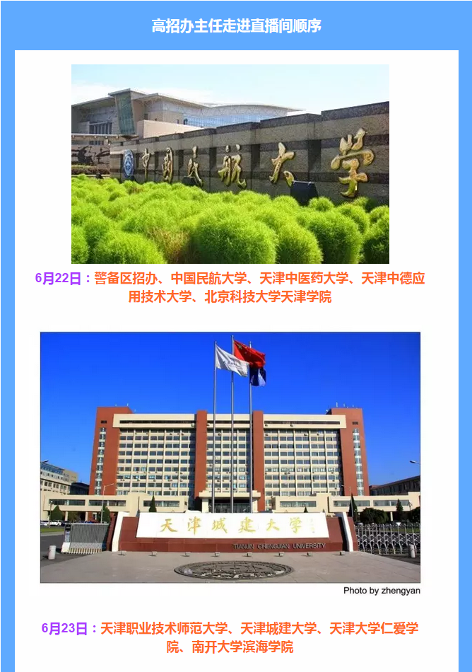 三、電臺訪談:天津人民廣播電臺將邀請市教育招生考試院、警備區招生辦、高校招生辦負責同志介紹高校招生情況,解答考生填報志愿的相關問題。具體播出時間:6月24日至26日,天津人民廣播電臺新聞廣播(每晚19:00—20:00);6月22日至27日,天津人民廣播電臺經濟廣播(每天早晨7:30— 8:30);6月21日至23日、27日,天津市廣播電視臺濱海廣播《都市零距離》(每天下午16:00—17:00)。