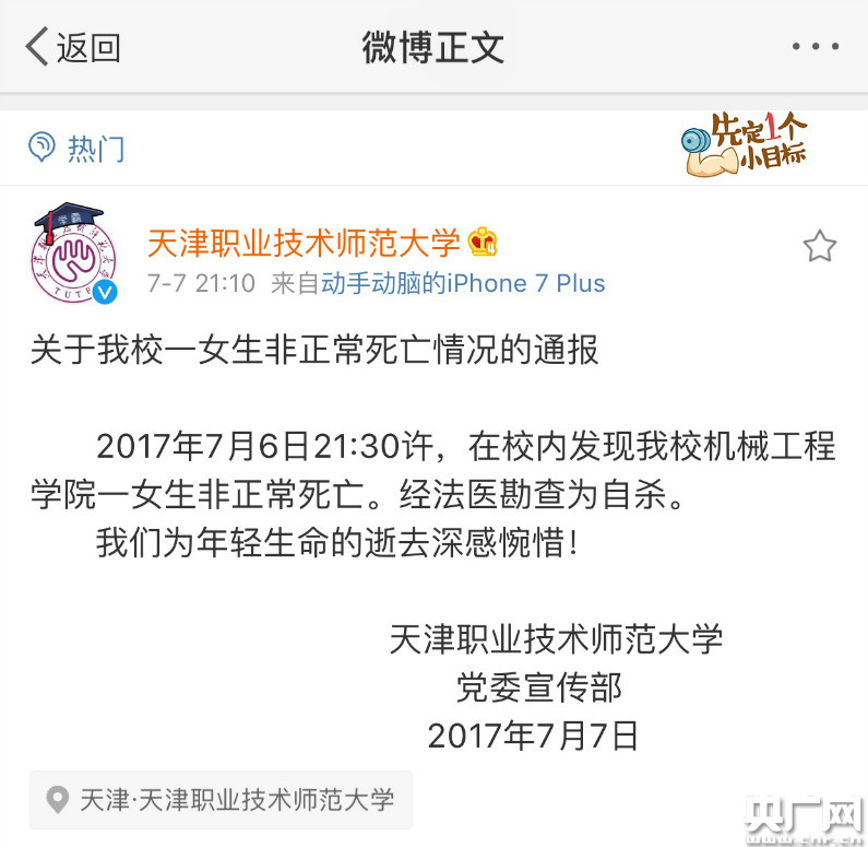 7月7日晚,校方發布情況通報:“2017年7月6日21:30許,在校內發現我校機械工程學院一女生非正常死亡。經法醫勘查為自殺”。