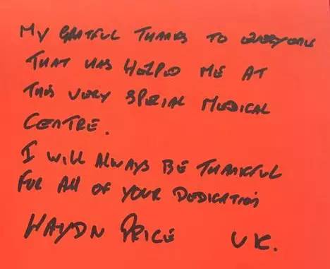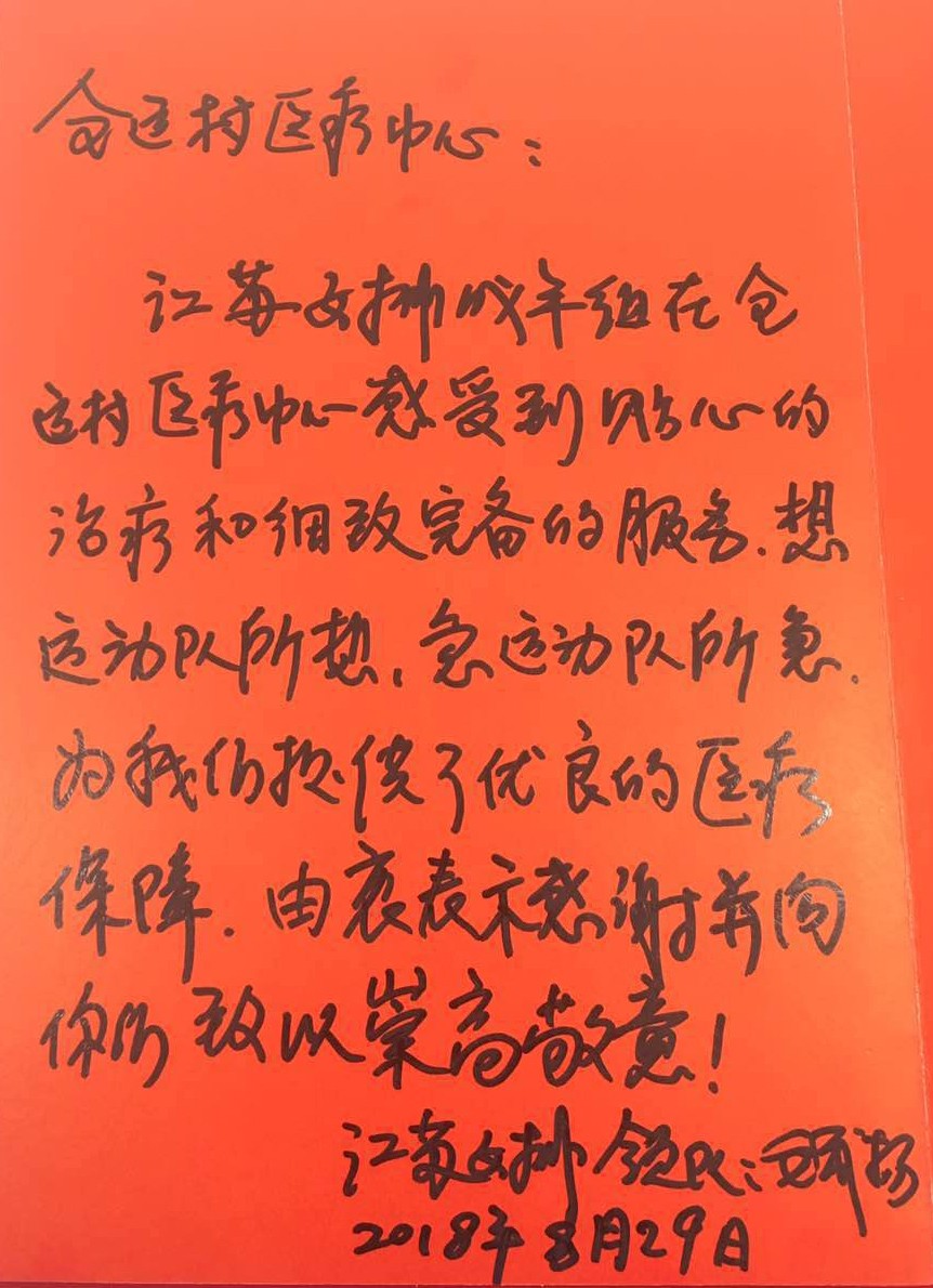 8月30日晚9點15分左右,香港代表隊英國籍馬術教練因咳嗽、胸痛到運動員村醫療中心就診,由于患者不會說中文,全運村聯絡員梁靜給予全程英文講解,作為內科醫生的梁靜仔細詢問了患者的病史,并進行了詳細的查體,建議患者進行了心電圖及血常規的檢查,經過診治考慮患者為支氣管炎,詳細告知患者注意事項并給予藥物治療,藥劑科王楠耐心地用英文講解藥物使用的說明。患者對醫療中心的就診環境,快捷的診治,熱心及周到的服務表示非常滿意,評價incredible,同時用英文寫下自己的就診感受“MY grateful thanks to everyone.That helped me at this very special medical center.I will always be thankful for all of your dedication!