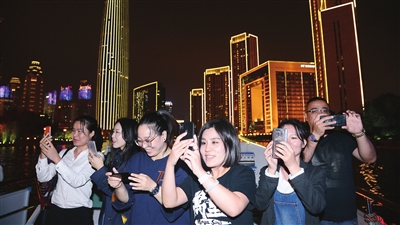 隨著游船緩緩駛出碼頭,大家趕緊拿出手機、相機,選好角度,架起“長槍短炮”,時刻準備著定格最美瞬間,生怕錯過任何一處景致。的確,記者在船中也有著同樣的感受:遠遠望去,海河夜景呈現出橘與黃搭配的暖色調,在這種充滿藝術感的氛圍中,海河水面閃爍的波光燈影的美、流動不息的美,揮之不去,一種歡喜而眷戀的心情油然而生。