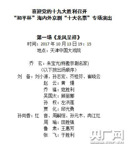 記者了解到,演出采取“多人飾一角,接續(xù)登場”的方式進行。其中,13日演出的全本《龍鳳呈祥》將特邀京劇名家朱寶光領銜出演喬玄,由天津京劇院優(yōu)秀青年演員左洪蓮飾演孫權。昔日的“十小名票”劉小源將與孫志宏、齊桂芬、崔曉云一起聯(lián)袂登場飾演劉備。紅音、周嗣恒、孫元木、冉江紅飾演孫尚香。顧麗娜飾演吳國太、黃熳飾演趙云、寇勝利飾演喬福、邱光勇飾演賈化、田勝強飾演周瑜、王惠芳飾演魯肅、于勝利飾演張飛。