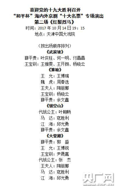 10月14日演出《紅鬃烈馬》,包括《武家坡》、《算糧》、《銀空山》、《大登殿》四折。薛平貴由葉慶柱、何一明、付晶晶、余文鑫、郭盛飾演。王寶釧由王雅雯、王開顏、楊曉云、尹晟嘉飾演。陶麗娜飾演王夫人、已經(jīng)成為專業(yè)演員的葉翱暢和張杰飾演代戰(zhàn)公主、王博瑞飾演王允、周春選飾演魏虎、寇勝利、邱光勇飾演馬達、江海。兩場演出均由天津京劇院擔任助演,充分體現(xiàn)出專業(yè)院團為弘揚國粹藝術甘當綠葉的品質(zhì)。