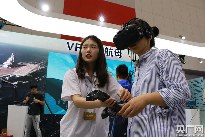 央廣網天津5月16日消息(記者褚夫晴)16日,第二屆世界智能大會在天津開幕。本屆世界智能大會除了會議、展覽、賽事,還增加了全新的智能體驗環節。圖為觀眾體驗VR虛擬航母。 -