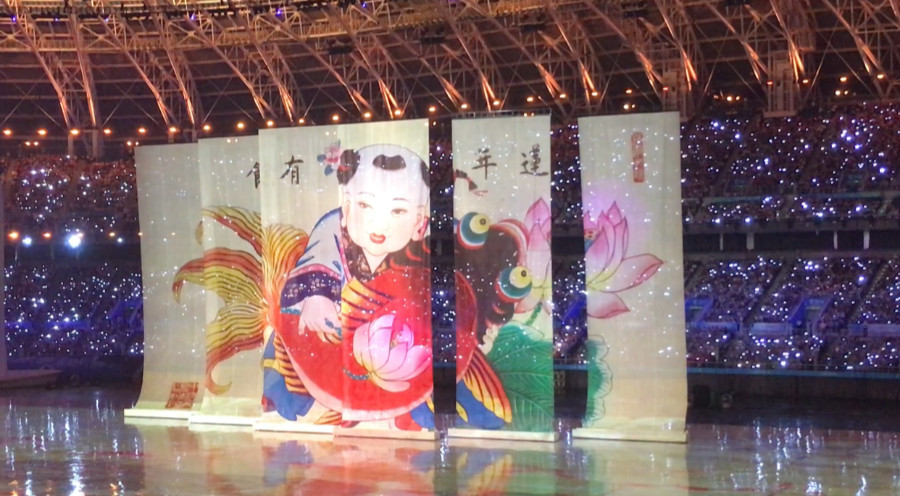 比如《逐夢遠航》是從五個方面來把握天津元素的。首先展演中呈現了古運河、海河、天津城市景觀等元素,反映了海河兩岸的歷史變遷,表達了我們對這片熱土的深情厚愛,比如開幕式上的海河浪花團體操,在飛濺的水珠中體現了很多當代體育的圖像,寓意天津的海河孕育出的體育精神。其次是歷史因素,天津是近代以來中國的縮影,有“中華百年看天津”之說,天津人民有著自新圖強光榮傳統和建設祖國復興民族的強烈意志,開幕式上霍家拳的表演,它傳遞的精忠報國的精神和精衛鳥鍥而不舍的精神,是中華民族復興的強大動力。然后是文化藝術因素,天津有著濃郁的文化特色,比如漕運文化、楊柳青年畫等等標志性元素也融入了開幕式當中。