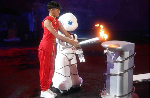在火炬傳遞環節,首創將場內火炬傳遞延伸進觀眾席,火炬所到之處,激發觀眾手中紅色發光物燃亮,以“火光帶動燈光”在視覺上形成燈火相映、光芒燃動的震撼效應。這是一次獨特的看臺景觀設計,造就了一次參與人數眾多的火炬傳遞,也體現了“全運惠民,健康中國”的主題,采取津娃與智能機器人攜手點燃圣火的方式,這是傳統與現代的碰撞、是文化與科技的交握,寓意天津對未來的邀約——以體育的名義,誠邀天下;以圣火的光芒,啟動未來。