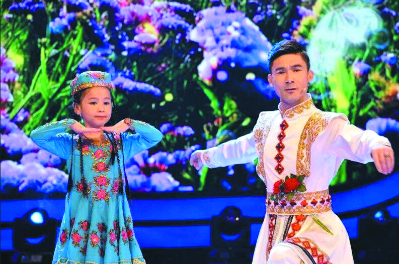 艾麗菲·努爾·吐爾遜同爸爸一起表演節目。