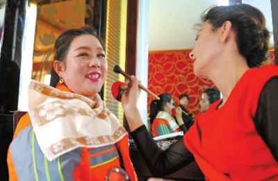 3月8日,在延安路一家照相館,化妝師正在給天山區(qū)新東街社區(qū)環(huán)衛(wèi)工人羅艷平(右)化妝,這是今年50歲的羅艷平第一次拍藝術(shù)照