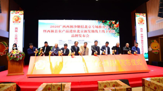 當日,推介會上商賈云集,賓朋滿座,大家一起品桔子,敘友情,謀發展,求共贏。“2020年西林沙糖桔推介活動”正式啟動,將活動氛圍推向高潮。活動中舉行了西林沙糖桔區域公用品牌揭牌儀式。西林縣與北京新發地農產品發批市場簽署戰略合作協議,西林企業、電商代表與銷售流通企業進行產銷對接簽約,達成了當日簽約銷售西林沙糖桔近7000噸,產值超過5000萬元。