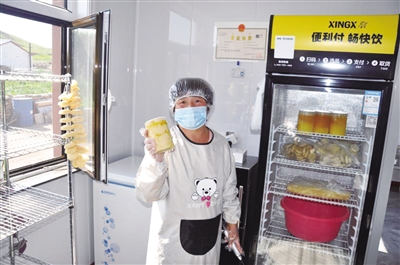 沙日格臺嘎查村民佟雙節展示自己制作的奶制品。